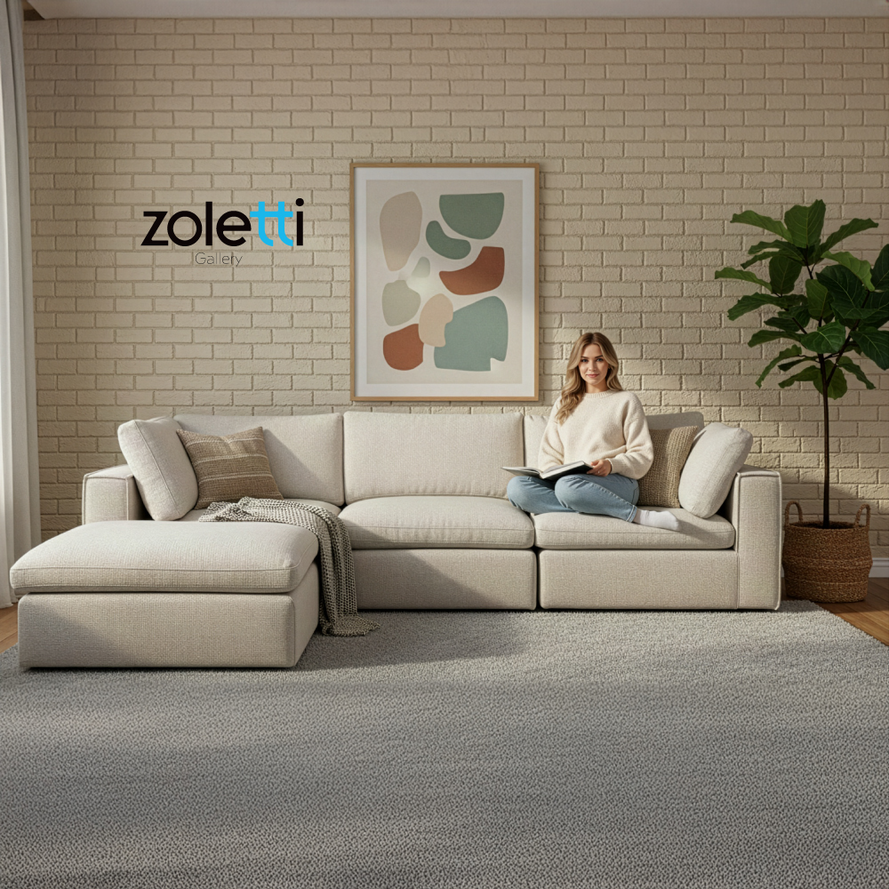 ZOLETTI - The Marius fabric sofa by Zoletti, part of their premium lounge collection, is a sophisticated contemporary piece designed to serve as a plush centerpiece for modern living spaces. This specific configuration, shown in the elegant Milan Wheat fabric, features a spacious three-seater design with an integrated right-hand chaise, offering a perfect balance of structured support and "sink-in" comfort through its overstuffed, high-grade foam cushioning. True to Zoletti’s reputation for durability, the Marius is built upon a certified solid timber frame and a superior suspension system, ensuring the silhouette maintains its clean lines and soft, tapered arm details over time. With its neutral, textured weave and low-profile block feet, the sofa effortlessly anchors a room, blending Italian-inspired aesthetics with the practical luxury required for everyday family lounging.
