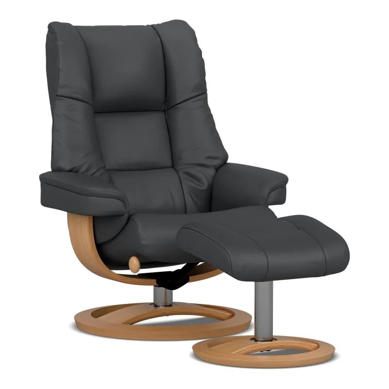 The IMG Nordic 60 with ottoman is a comfortable and stylish seating solution that showcases authentic Scandinavian design. Constructed with a solid steel frame and laminated wood yoke, the chair features a high-resilience, cold-cure molded foam interior for superior support. Key features include a 360-degree swivel, an adjustable headrest, and the Comfort-Glide system, which allows for effortless reclining. The matching sloped ottoman is designed to support the legs and improve circulation. Customizable with various sizes, leather and fabric options, and timber finishes, the Nordic 60 blends comfort with modern design.