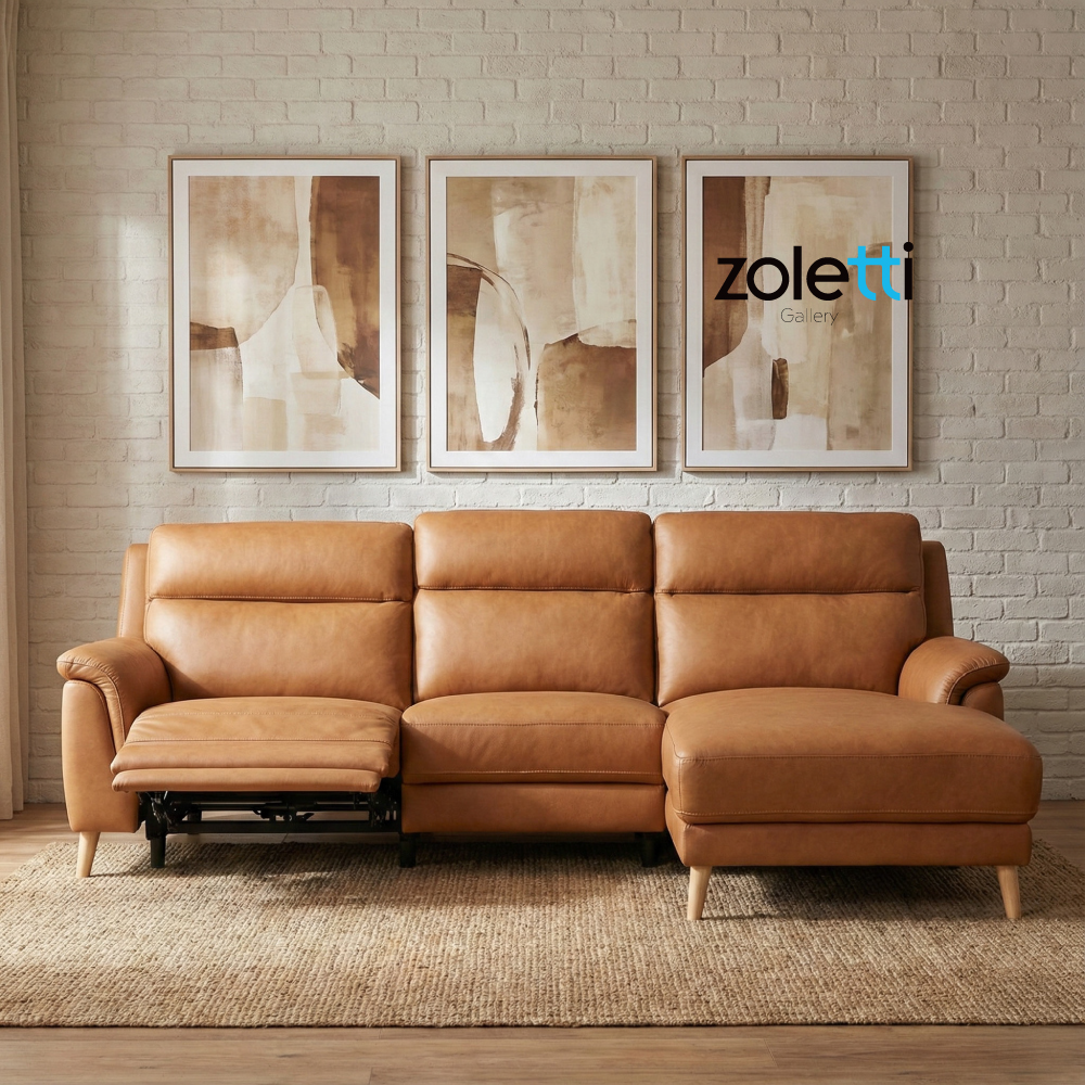 The Zoletti Varese Sofa with Chaise seamlessly blends comfort and functionality, featuring a comfortable chaise lounge on the right for expansive relaxation and an electric recliner on the left, with an effortlessly easy to use button on the armrest. Upholstered in a choice of fabric or leather options, it offers a soft and inviting aesthetic that complements various interior styles. The sofa is elevated by stylish, tapered light-coloured oak wooden legs, contributing to its modern appeal and ease of cleaning underneath. With individually cushioned, segmented backrests providing excellent lumbar support, this sofa is designed for long-lasting comfort and makes for a versatile and elegant centrepiece in any living space.